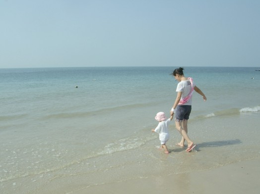 海灘上留下了無數(shù)指尖大小的小孔隙,出于好奇,我蹲下來靜靜地觀察,發(fā)現(xiàn)有小小的螃蟹從小孔隙里爬出來,象我一樣好好沐浴燦爛陽(yáng)光、溫暖海風(fēng);有些頂著米粒大的沙團(tuán)推出小孔隙,原來是小螃蟹寶寶在造穴,多勤勞呀,從小就養(yǎng)成了愛勞動(dòng)的習(xí)慣;最好玩的是好不容易逮著一只螃蟹寶寶放在手心任其橫行霸道,直癢得我開懷大笑……..